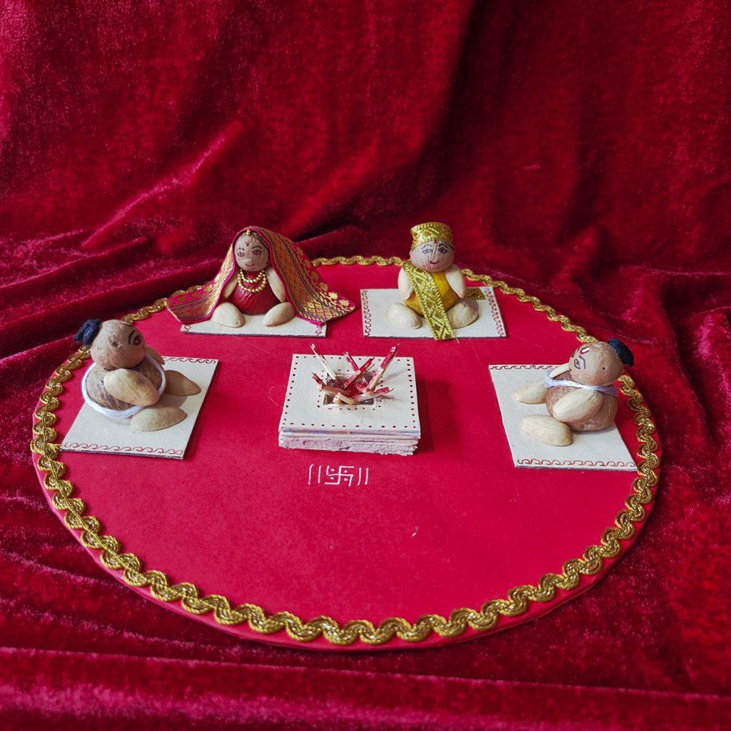Handmade Supari Bhadji with bride and groom figures, crafted from betel nut and decorated in vibrant red.