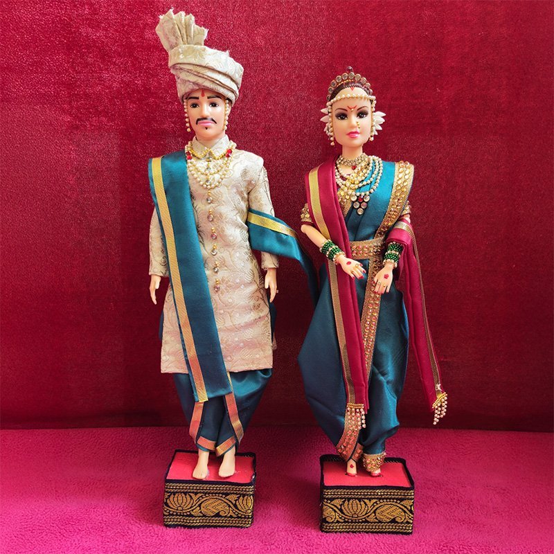 Why Choose Our Dolls? We specialize in creating personalized Navra Navri dolls that artistically represent your wedding attire’s color and style, making them cherished keepsakes.